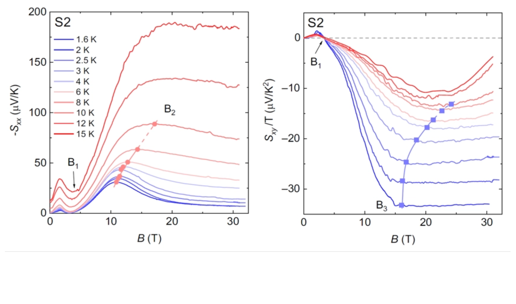 该研究团队在强磁场条件下发现了一种全新的热电转换机制。通过对弱拓扑绝缘体五碲化铪(HfTe₅)在0–33 T强磁场下的塞贝克效应和能斯特效应进行系统测量,研究团队直接观测到两个磁场诱导的相变。