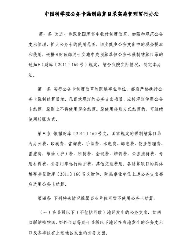 中国科学院公务卡强制结算目录实施管理暂行办法