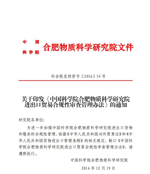 关于印发《中国科学院合肥物质科学研究院进出口贸易合规性审查管理办法》的通知