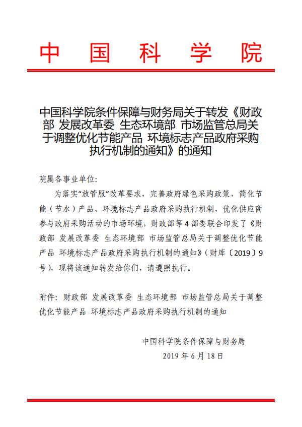 中国科学院条件保障与财务局关于转发《财政部发展改革委生态环境部市场监管总局关于调整优化节能产品环境标志产品政府采购执行机制的通知》的通知