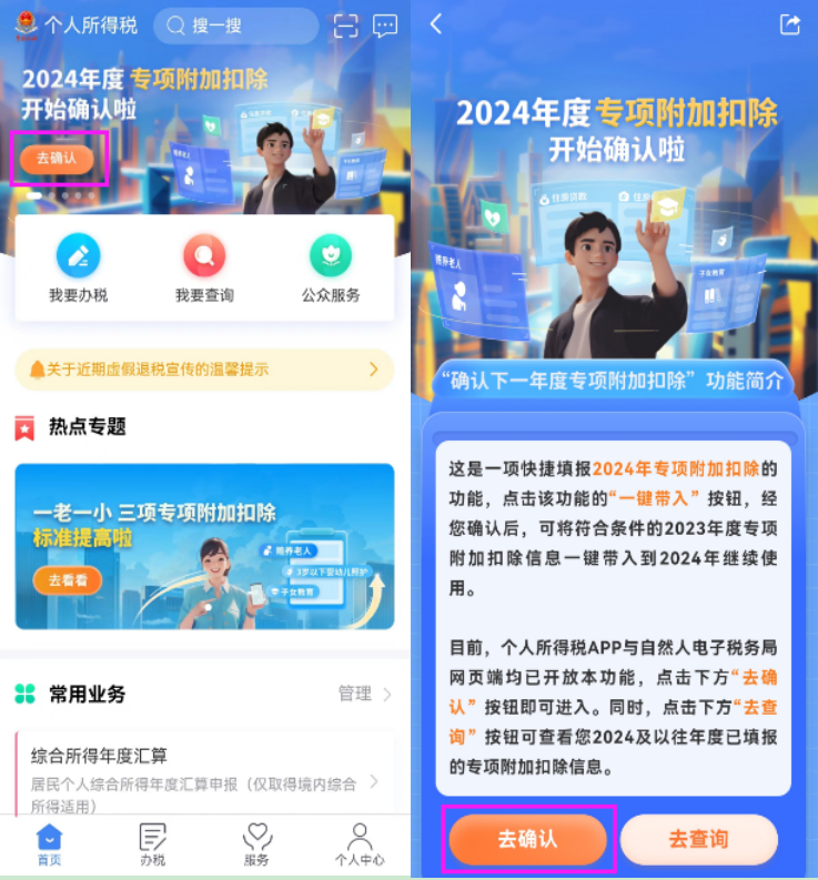 根据《国家税务总局关于修订发布<个人所得税专项附加扣除操作办法 (试行) >的公告》(国家税务总局公告〔2022〕7号)规定,纳税人需在2023年12月31日前,对2024年的专项附加扣除进行确认。请您尽快进入个人所得税APP进行查看。