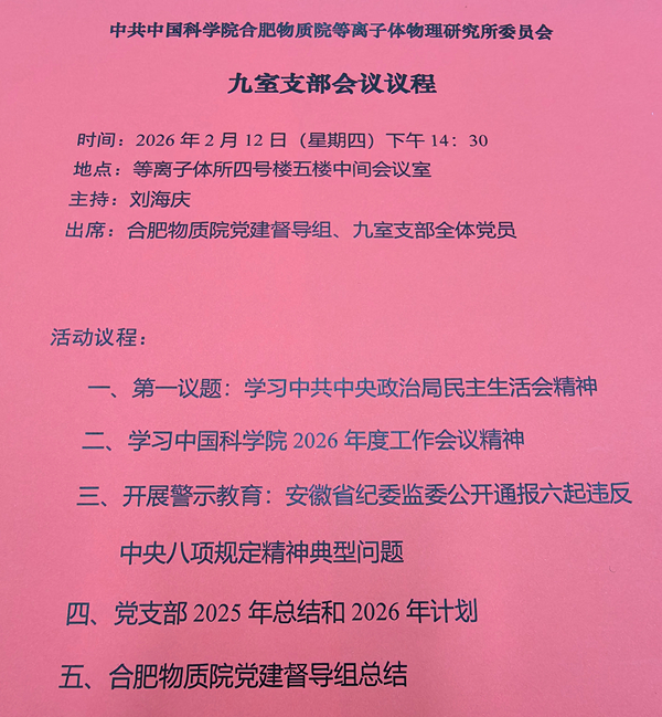 2月12日下午,合肥物质院等离子体所九室党支部召开支部大会。会议由党支部书记刘海庆主持,全体党员、预备党员及入党积极分子参加会议。合肥物质院党建工作督导组组长邹士平一行列席会议并进行指导。