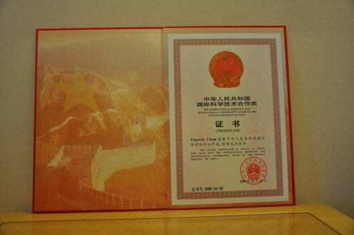 1月11日,应国家科技奖励办的邀请,Vincent Chan 博士携夫人Pauline Chan出席了在北京人民大会堂隆重举行的2009年度国家科学技术奖励大会,与其它获奖代表一起上台从国家领导人手中接过大红的获奖证书。1月12日晚,科学技术部在北京人民大会堂举办国家科学技术奖励大会专场音乐会。Vincent夫妇被安排坐在第一排,与中共中央政治局委员、国务委员刘延东,科技部部长万钢与2009年度国家科学技术奖获奖者代表、全国科技工作会议代表、有关部门领导及首都科技界代表共6000人一同观看了演出。