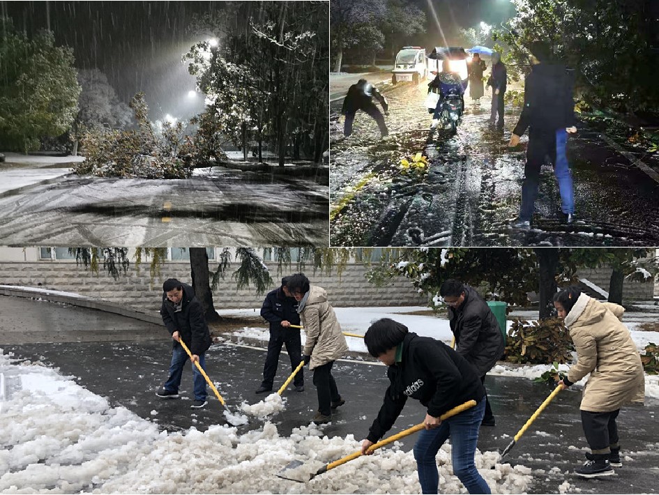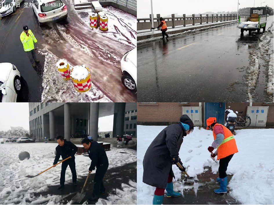 晚上10点多钟,二号楼北道路被一棵刮倒的大树拦死,服务中心即刻组织安保和绿化人员冒着风雪前往现场处置,经过近一个小时努力,将倒下的树枝清理完毕,保障了该道路畅通。纷纷扬扬的大雪下了一夜,9日凌晨5点多,科学岛创新大道上很多树枝被积雪压断,中心立即启动应急预案,要求绿化、环卫工人上路清理断枝,保卫人员上路执勤,指挥疏散车辆,水电保障部门加强巡检,车队驾驶员谨慎驾驶。并第一时间组织人员对东西区“3H”公寓、二号楼、交叉实验楼等门前的积雪进行清扫,对南大桥桥面易结冰路段抛洒融雪剂。多项举措方便了大家出行,缓解了早高峰时段交通拥堵状况。
