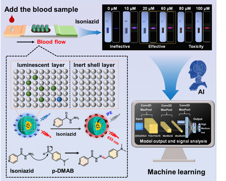 此外,研究团队基于上转换纳米粒子(UCNPs)的结构精准调控,成功开发出一种可用于全血中药浓度实时监测的智能传感平台。为解决传统检测方法在复杂血液基质中信号干扰强、操作繁琐、无法实时监测的技术瓶颈难题,研究人员设计构筑了NaYF₄:Yb,Tm@NaYF₄核壳结构纳米颗粒,有效抑制了表面淬灭效应,显著提高了上转换发光效率和光稳定性。通过将对二甲氨基苯甲醛(p-DMAB)和纳米颗粒结合,构建出高特异性比率型荧光探针,在无需样本预处理的情况下,实现了对抗结核药物异烟肼的快速、高信噪比视觉化检测。该平台结合3D打印封装、智能手机成像与卷积神经网络(CNN)分析,实现了荧光信号与药物浓度的自动精准映射,为药物积累引起的肝毒性和神经病变个体化监测及临床诊断提供了强有力的技术支撑。