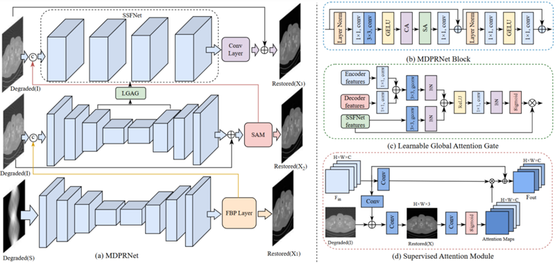 图1.展示了用于稀疏视角CT重建的MDPRNet模型整体架构,采用多阶段渐进式重建框架。早期阶段使用U型网络从正弦图和CT图像中提取多尺度特征,最终阶段采用单尺度网络(SSFNet)在原始分辨率下重建,以保留细节纹理。