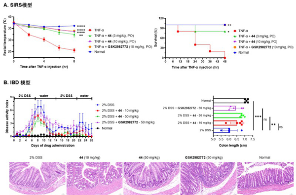 化合物44在多种炎症性疾病动物模型中的治疗效果