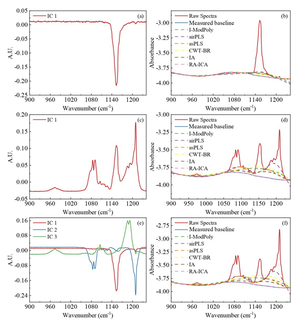 为减少混合气体吸收峰重叠导致的基线校正误差的影响,团队研发了相对吸光度的独立成分分析(RA-ICA)算法(李新春,Optics Express 2024)。通过计算相对吸光度光谱、提取独立成分、重建隐藏基线,使得设备对混合气体吸收峰重叠导致的基线校正误差显著低于常用方法,还能精准保留基线细节,满足多气体组分同时精确测量需求。该算法首先计算剔除基线信息的相对吸光度光谱,随后结合比尔-朗伯定律与独立成分分析,提取包含各组分吸收峰信息的独立成分,对需基线校正的光谱进行拟合。最后采用多项式曲线与残差相结合的基线模型,重建吸收波段的隐藏基线。仿真与实验结果表明,RA-ICA方法重建的基线误差显著低于其他常用基线校正方法,且能准确保留基线的细节特征,能够提供高质量的校正基线,满足多气体组分同时精确测量的需要。