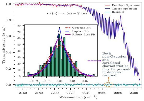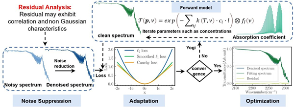 在实际浓度反演过程中,传统最小二乘等方法受到噪声和基线漂移等光谱干扰的影响,其气体光谱定量结果准确性受限。为提升浓度反演精度,团队提出了“抑制 - 适应 - 优化”模型,实现了光谱降噪、残差建模以及损失优化的有机结合,为FTIR光谱的浓度反演提供了一种更具鲁棒性的方法(王钰豪,Optics Express 2025)。该模型融合光谱降噪、残差建模与损失优化技术,能为工业监测、交通排放等场景的浓度反演提供鲁棒方案。该算法首先通过噪声抑制技术提高用于反演的光谱数据的质量,然后利用Ljung-Box检验和分位数-分位数图等统计工具对降噪后光谱数据与前向模型的残差分布进行分析,并采用Barron提出的广义损失函数进行适应,最后采用Yogi优化器进行损失优化,实现气体浓度反演。模拟和实验光谱验证了该模型在均方根误差噪声为1×10-3光谱数据集中的性能,相比于传统方法,可以将CO2、N2O和CO的反演精密度提高15%。实验结果表明,该方法在工业监测、环境研究以及交通排放等领域具有广阔应用前景。