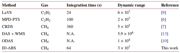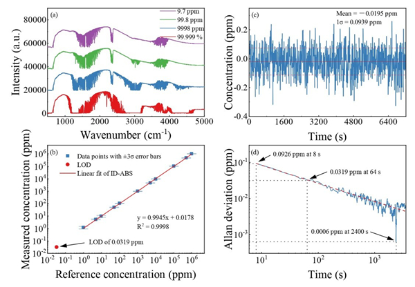 除此以外,FTIR光谱的宽带多组分检测能力,但分析波段的选择影响定量准确性。为此,该团队提出了一种基于信息密度的自适应波段优选(ID-ABS)方法(李新春,Optics Express 2025),以纠正高浓度下吸收饱和引发的光谱非线性响应、仪器分辨率限制以及基线重建误差等问题。该模型整合谱线强度、吸收饱和特性、仪器线型函数及基线特征,动态评估全光谱信息密度分布,进而优选各组分反演参数,确定最优反演波段,最后通过非线性多元回归迭代更新参数,直至收敛。实验验证表明,该方法对甲烷定量分析的线性动态范围达到3×107(R2=0.9998)。ID-ABS 模型的适用性可拓展至其他具有红外吸收特性的气体,大幅提升了基于 FTIR 技术对复杂多组分混合物的定量分析能力。