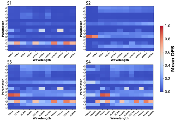 在观测场景 S1–S4 下,各参数的平均 DFS 与波长 (650 nm–2460 nm) 的关系