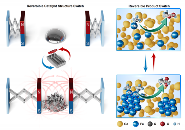 在该工作中,研究团队设计和展示了一种铁嵌入液态金属催化剂(Fe–LMS)。这种Fe–LMS催化剂可响应外部磁场强度的变化,实现了铁原子在孤立单原子(Fe₁-LMS)和聚集团簇(Feₙ-LMS)之间的可逆快速重排。因此,实现了CH₄氧化的主要液态产物CH₃OOH和CH₃COOH之间的可逆转化,并在室温下获得了1679.6 mmol gFe⁻¹ h⁻¹和790.5 mmol gFe⁻¹ h⁻¹的高产率,以及99.9%和91.7%的高选择性。通过ESR和MPMS、原位同步辐射光谱和理论计算,研究团队发现磁场切换影响了Fe–LMS的纳米结构、局部配位环境和电子自旋,导致决定C1或C2反应路径的中间物种的产生。特别是,外磁场环境中铁原子聚集态和电子自旋态的改变打破了与反应分子的吸附能标度关系,从而改变了反应选择性。该研究发表在Nature Nanotechnology上。中国科学技术大学吴宇恩教授、合肥工业大学郑磊教授、中国科学院合肥物质院强磁场中心胡林研究员及河南省科学院钟文辉研究员为论文共同通讯作者。
