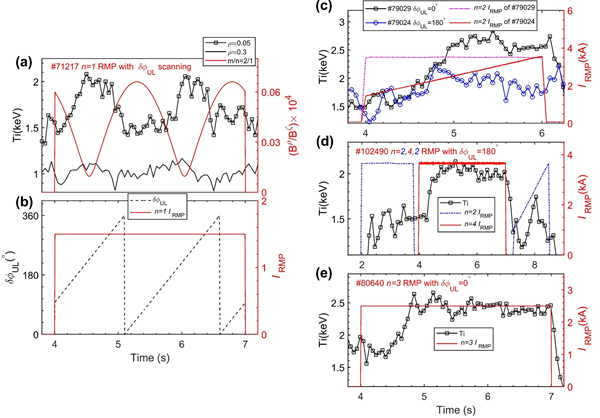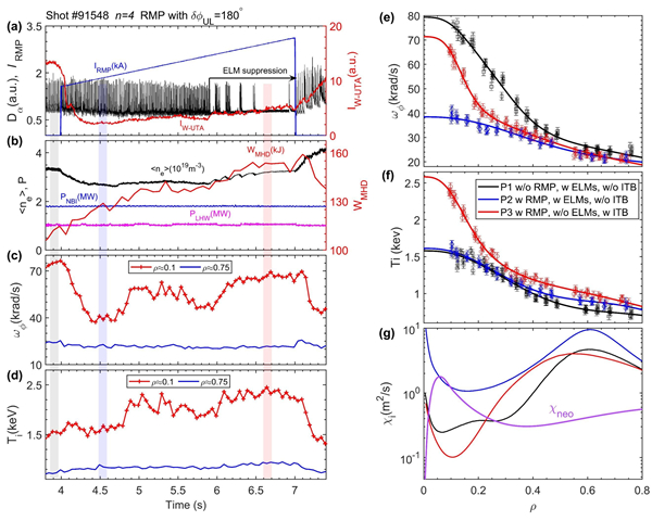 兼具堆芯ITB和边界输运垒(ETB)的高约束模式是未来磁约束托卡马克聚变堆的理想运行模式,但这一模式需要同时解决多个关键挑战。在等离子体芯部,ITB难以产生、维持和控制,特别是在未来钨壁装置中,还需要有效控制钨杂质聚芯。在等离子体边界,ETB虽然能够稳定产生,但通常伴随着ELM的爆发,会对第一壁材料造成严重损伤,因此未来聚变装置必须实现有效的ELM控制。RMP作为一种有效的ELM控制手段,在过去的研究中往往需要以牺牲部分约束性能为代价。