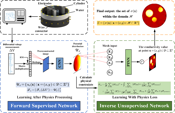 针对上述瓶颈,该研究提出了一种融合监督学习与非监督学习的双阶段物理嵌入成像策略。该框架创新性地将成像过程解耦为两个阶段:首先利用结合物理预处理的卷积神经网络(CNN)在现实可行的点电极激励条件下预测内部离散电势分布;随后引入基于偏微分方程约束的 PINN,通过离散数值微分实现电导率反演。该设计不仅显著降低了传统 PINN 对光滑电导率假设的依赖,还将多正向网络耦合训练的问题简化为单一正向网络与单一逆向网络,从根本上改进了训练不稳定与收敛困难的EIT反演问题。