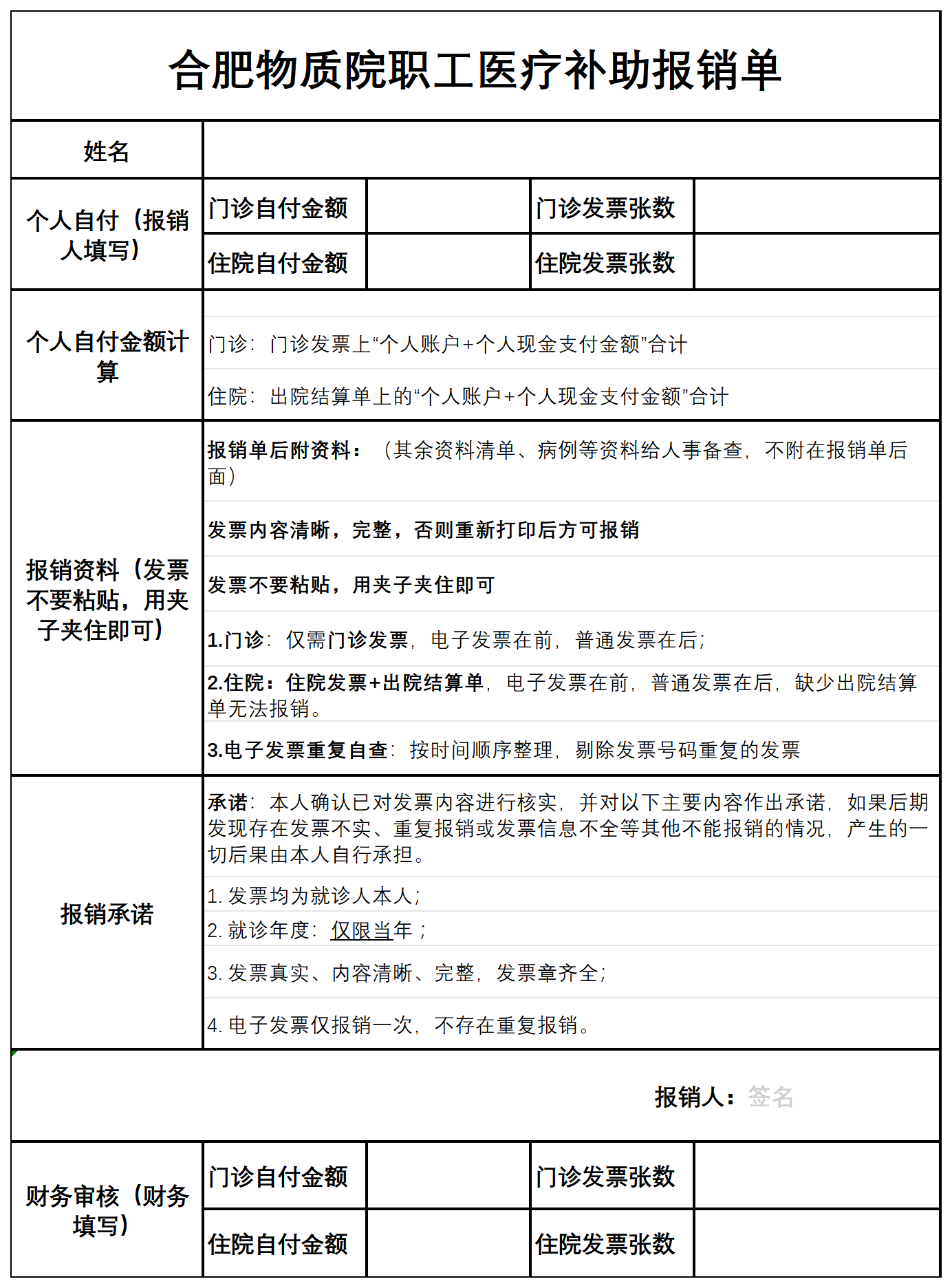 3、请职工填写《合肥物质院职工医疗补助报销单》(见附件),自行下载打印填写后作为报销封面,分别计算门诊和住院个人自付金额合计数,提供财务审核,财务处人员初步审核原始发票,人事处工作人员审查是否属于医疗补助范围内的费用,经分管领导复核后,上报审批,补助金额打入职工个人工资卡。