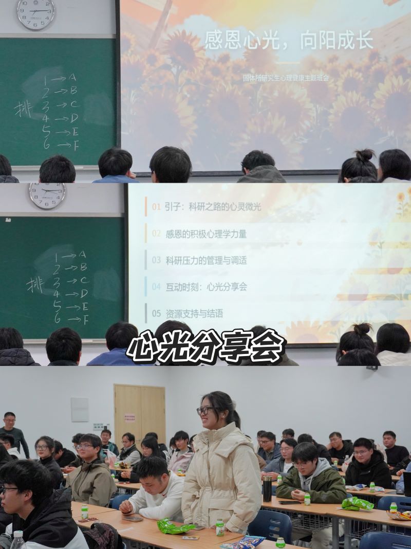 为筑牢研究生心理健康防线,营造温暖和谐的班级氛围,帮助同学们缓解期末学业压力,12月4日,固体所25级硕士班在中科大高新校区GH407教室举办“感恩心光,向阳成长”冬季心理健康主题活动,班主任胡忠辉老师亲临指导,50余名班级同学积极参与,共赴一场治愈身心的温暖之约。