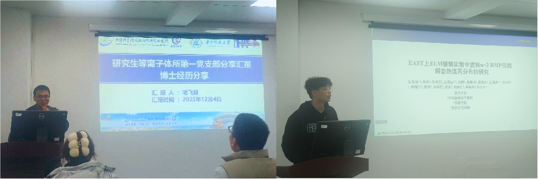 活动在党支部书记石金泽的简要介绍中拉开序幕。首先分享的毛飞越师兄。他在介绍自身科研工作内容的同时,也为我们分享了科研中故事,比如在J-TEXT装置上做实验时,遇到了意外打火的现象,在疫情期间,由于实验室总体处于半放假的状态,学生几乎全权负责装置运行。这些事情是“意外的困难”,但也是有趣的体验。而谈及未来发展,他结合亲身经历,同样倾囊相授:如毕业之前要明确毕业条件,避免内耗,以及及时总结科研工作的结果。师兄深入浅出的介绍让我们加深了对科研的认知,最后以“广阔天地,大有作为”为结语鼓励我们更上一层楼。紧接着,陈高廷师兄带来了内容坚实的专业分享。他介绍了自己最新的科研工作,关于EAST上RMP引起瞬态热流再分布的研究。他先是为我们介绍H模,台基区等基础概念,再介绍研究的背景和意义,然后介绍自己的研究思路和方法,如何处理实验数据,以及最后对数据的分析讨论。一步步的为我们展示了如何做出一项优秀的科研成果。