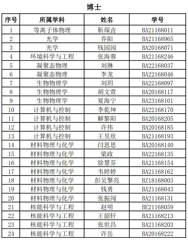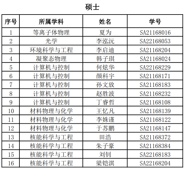 根据《中国科学技术大学关于做好2023年国家奖学金评选工作的通知》要求,研究生院科学岛分院评选出24名博士生和17名硕士生拟获得2023年研究生国家奖学金,现将名单公示如下,公示期限:2023.10.24—2023.10.30,如有异议,请联系研究生处,所有初选通过学生的申报材料可供查阅。
