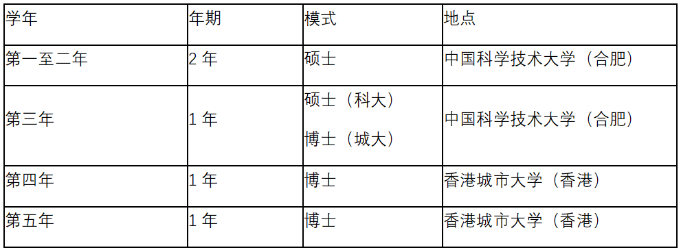 硕博连读项目的修读年限一般为五年。获录取的硕博连读生在中科大修读硕士课程,为期三年,第三年保留中科大硕士生身份,并同时获得城大博士生身份。在完成硕士课程学习后在城大(香港本部)修读博士课程及完成学位论文。学生可以在修读博士课程期间,完成中科大的硕士学位论文和发表文章的要求,并申请中科大的硕士学位。城大的博士学位正常期限为三年。培养模式如下: