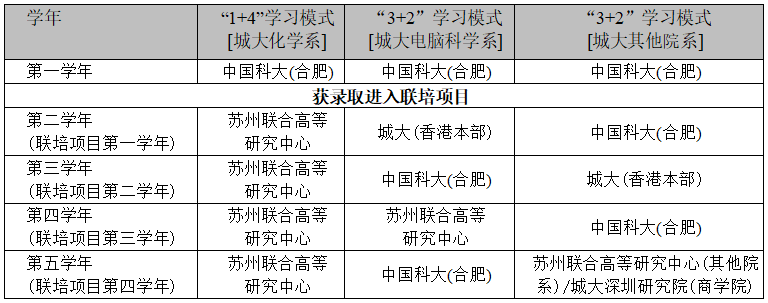 联培项目的修读年限一般为四年。原则上学生第一学年在中国科大修读并完成公共必修课和学科基础课程,第二至第五学年按以下学习模式分别在中国科大、城大及城大认可的内地校区(本联培项目包括中国科大-城大联合高等研究中心(苏州)和城大深圳研究院),修读部分专业课及完成学位论文。