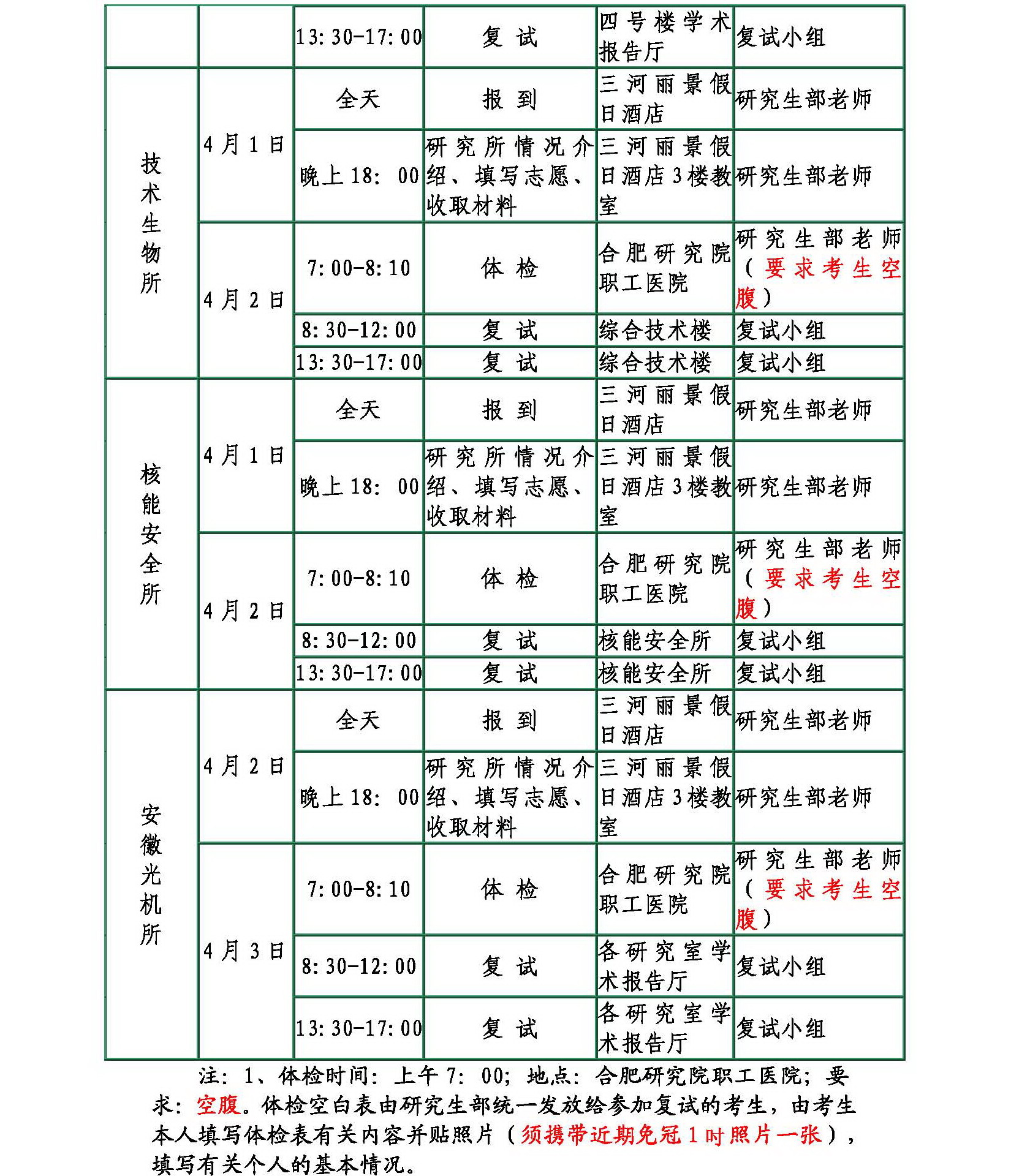 中科院合肥研究院二○一四年硕士研究生入学考试复试日程安排