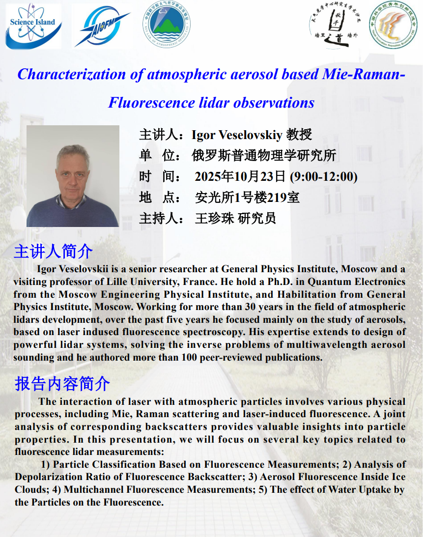 【10.23】学术报告:Characterization of atmospheric aerosol based Mie-Raman-Fluorescence lidar observations