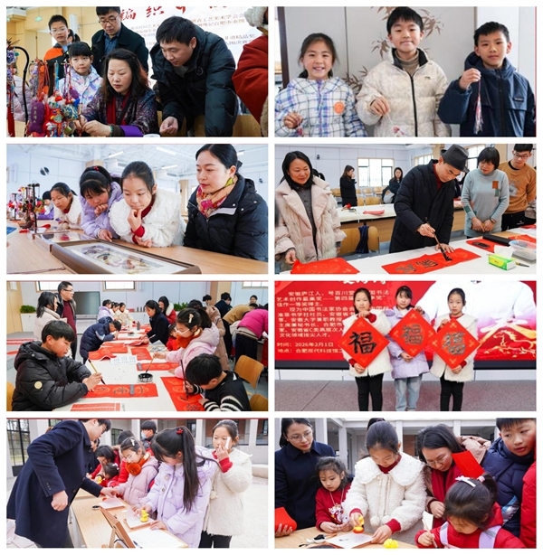 活动首日推出了“编织中国结”“写春联送祝福”“拓印”等体验项目。当日上午,合肥现代科技馆科普报告厅人头攒动,庐州绳记合肥市市级非遗项目创始人岳红现场为公众传授中国结的制作方法,让大家在实践中感受传统文化魅力。下午,写春联送祝福活动现场墨香四溢。第四届“兰亭奖”佳作一等奖得主凌海涛挥毫泼墨,一句句蕴含新春祝福的联文跃然纸上,赢得阵阵喝彩。合肥物质院职工子女和游客主动参与,临摹书法作品、书写对联,现场气氛欢乐祥和。
