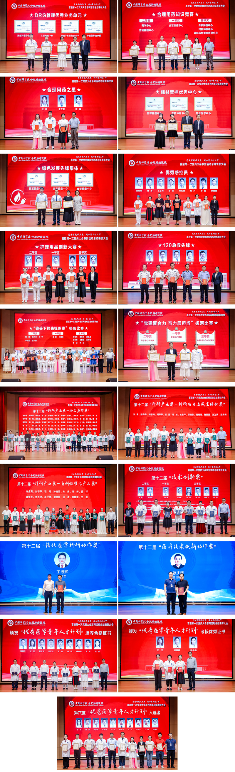 表彰大会对肿瘤医院喜迎第一次党员大会系列活动中的“DRG管理优秀业务单元”“合理用药知识竞赛”“耗材管控优秀中心”“绿色发展先锋集体”“优秀感控员”“护理用品创新大赛”“120急救先锋”“摄影比赛”“拔河比赛”,第十二届“科研产出奖”“技术创新奖”“转化医学科研协作奖”“医疗技术创新协作奖”的获奖团体和个人进行了表彰。会上,还颁发了肿瘤医院首批“优秀医学青年人才计划”培养合格证书、考核优秀证书,第六批“优秀医学青年人才计划”入选者证书等。