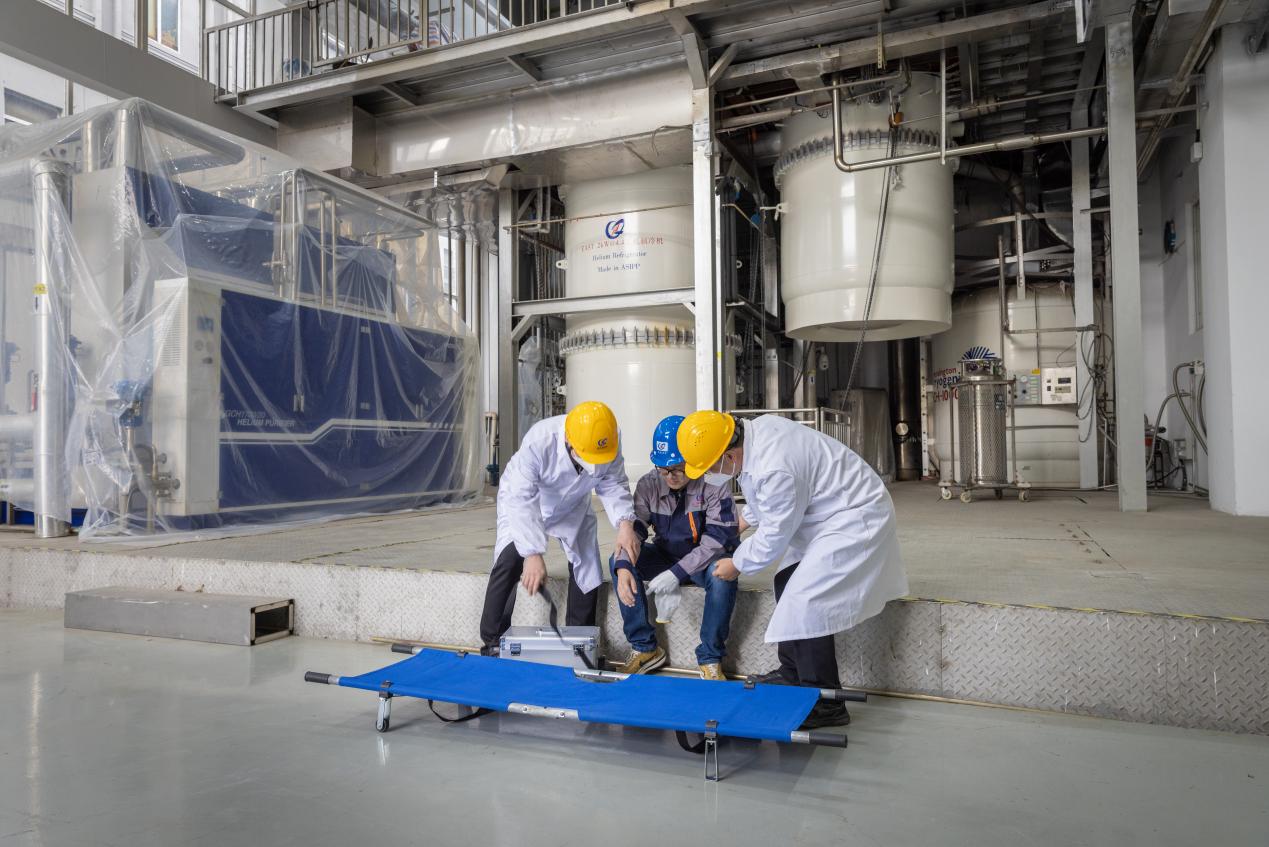 演练模拟了实验人员在操作过程中发现液氮杜瓦超压,安全阀未动作,1人进行泄压时手部冻伤。参与人员在接到启动应急预案的通知后迅速响应,按照应急预案进行了人员疏散、现场救援、故障修复等处置流程。整个演练过程紧张有序,参与人员积极配合,展现了良好的应急处理能力和团队协作精神。