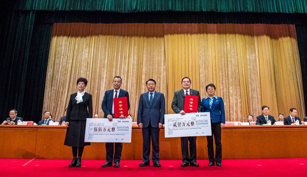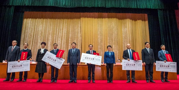 与会领导为入选“国内外顶尖人才引领计划”的5位院士和中国科学技术大学、中科院合肥物质科学研究院2家培养单位颁奖。