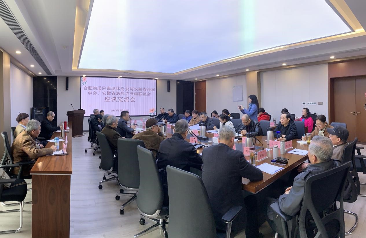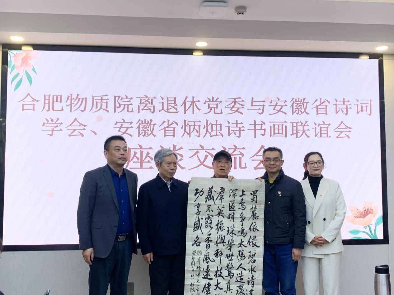 座谈会上,离退休党委书记王锐介绍了合肥物质院的基本情况,阐释了“重器巨帙、融合开放”的新时期科学岛创新文化,热忱欢迎各位诗书画专家老师到科学岛参观采风,期待双方促进文艺与科学联手互动,弘扬新时代科学家精神,为建设科技强国贡献力量。离退休党委副书记吴婧专题介绍了物质院离退休工作。近年来,离退休党委和人事处大力办好老年大学、老年协会和活动站,让老同志在“老有所学、老有所为、老有所乐”的文化平台上汇聚力量、陶冶情操、展示风采。2021年,物质院被评为中科院离退休干部工作先进集体。