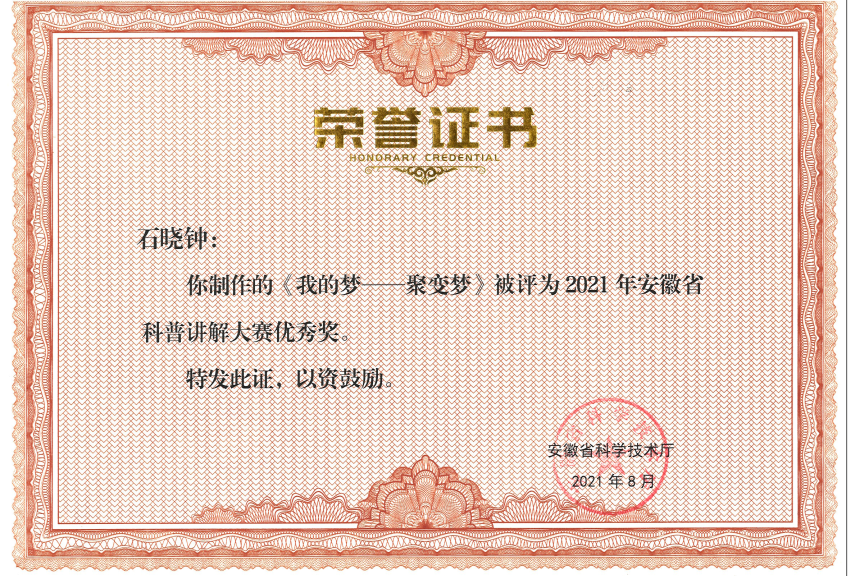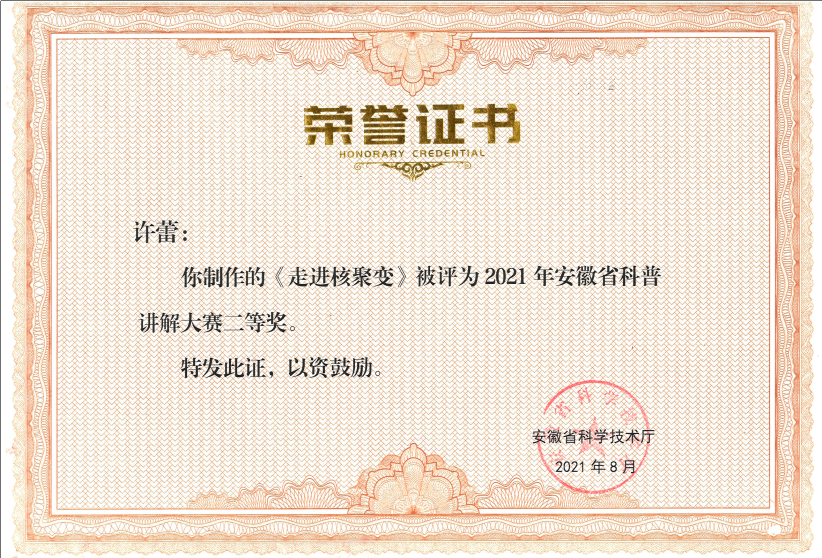 本次大赛由安徽省科学技术厅主办,参赛选手采用录制视频形式参赛,由安徽省科技厅邀请相关领域专家、省直有关单位科普工作专家打分评选。等离子体所选手以饱满的精神状态和专业的科普讲解水平获得了专家们的认可。