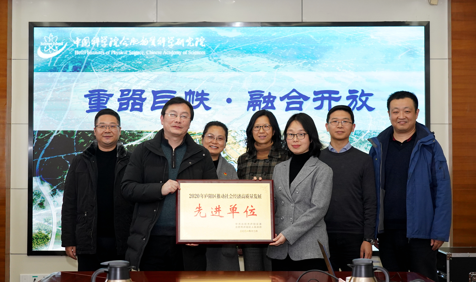 会议期间,朱华军代表庐阳区向合肥研究院颁发了 2020 年庐阳区推动社会经济高质量发展奖先进单位的奖牌,表彰合肥研究院在庐阳区社会经济高质量发展中做出的贡献。