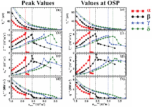 图2.具有不同几何封闭性的偏滤器靶板物理相关物理参量随上游电子密度的变化情况