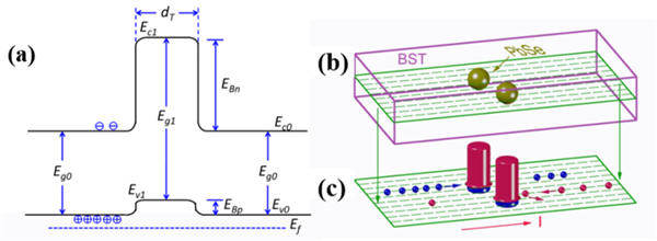 图1. (a) PbSe与BST的能带以及界面处势阱势垒示意图;(b) BST复合PbSe的示意图; (c) PbSe/BST复合样品中势垒(红色圆柱)与势阱(蓝色圆柱)对电子和空穴散射示意图,其中红球为电子,蓝球为空穴。