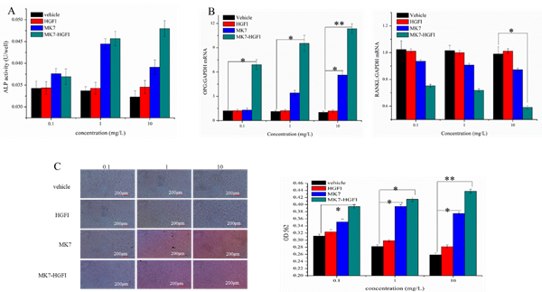 为了提高维生素K2的生物利用度,本研究利用两亲性载体蛋白对维生素K2进行亲水改性。通过优化载体蛋白与维生素K2(MK7)的混合摩尔比例,获得了在水溶液中均匀分散的球状纳米颗粒。将该维生素K2颗粒作用于MC3T3-E1细胞后发现,成骨细胞标志物碱性磷酸酶(ALP)、骨钙素、OPG/RANKL的表达均显著上调,细胞外矿化结节的形成也明显被加强,说明该维生素K2颗粒可有效促进成骨细胞分化。