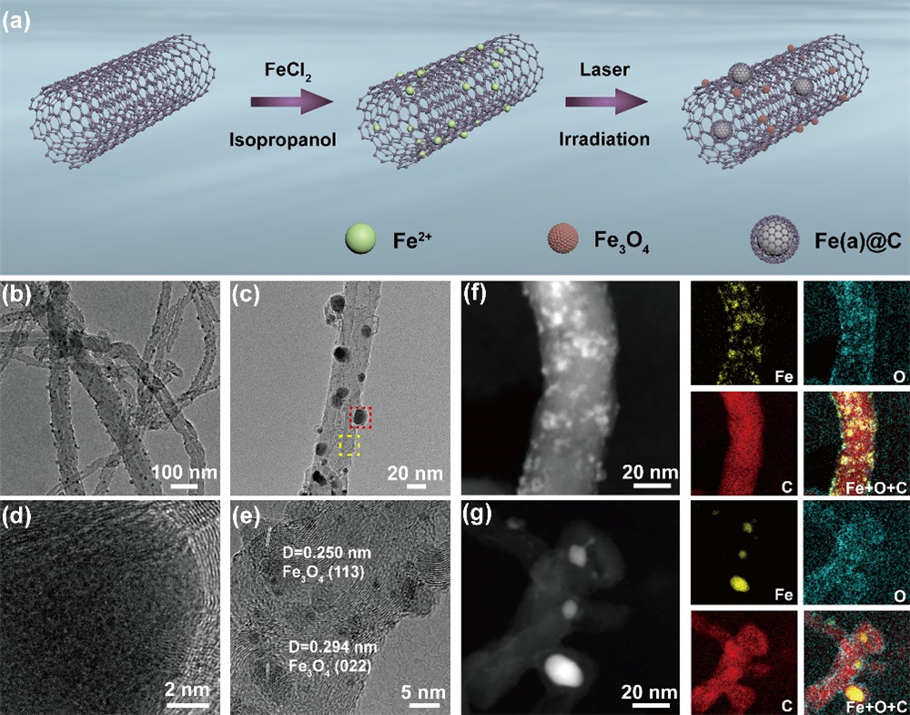 图1. (a) Fe(a)@C-Fe3O4/CNTs合成过程示意图;Fe(a)@C-Fe3O4/CNTs的低倍(b)和高倍TEM(c)照片;Fe(a)@C (d) (来自c中的红色虚线框)和Fe3O4 NPs (e) (来自c中的黄色虚线框)的HRTEM照片; (f)-(g) Fe3O4和Fe(a)@C的HAADF-STEM照片以及相应的元素映射照片。