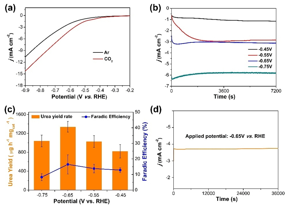 图2. (a)在Ar和CO2饱和的0.1 M KNO3中Fe(a)@C-Fe3O4/CNTs的LSV曲线;(b)在CO2饱和的0.1 M KNO3中以不同电位测量Fe(a)@C-Fe3O4/CNTs的计时电流线;(c) Fe@C-Fe3O4/CNTs的尿素产率和法拉第效率;(d) Fe(a)@C-Fe3O4/CNTs合成尿素的稳定性测试。