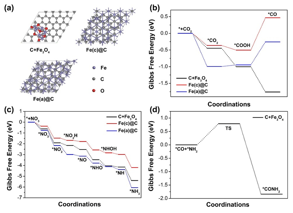 图3. (a) C+Fe3O4、Fe(c)@C和Fe(a)@C的结构;(b) CO2在C+Fe3O4、Fe(c)@C和Fe(a)@C上还原为*CO的自由能分布图;(c) NO3-在C+Fe3O4、Fe(c)@C和Fe(a)@C上还原为*NH2的自由能分布图;(d) C+Fe3O4上C-N耦合反应的自由能分布图。“*”表示活性位点。