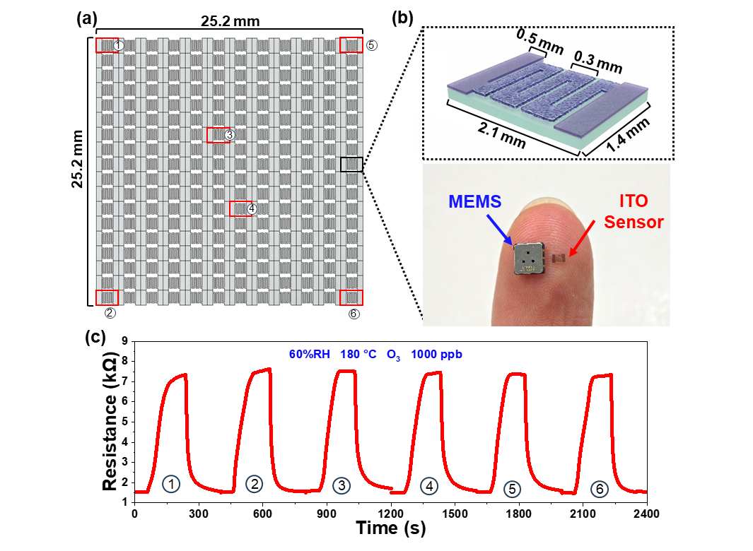 近日,中国科学院合肥物质院安光所孟钢研究员团队与山西大学卢华东教授、安徽大学郭庆川教授团队开展合作,以常规氧化铟锡(ITO)玻璃为基体,采用飞秒激光刻蚀与等离子体刻蚀工艺,设计了基于图形化ITO膜的臭氧(O3)传感器。该传感器凭借独特的自加热设计和等离子体表面改性技术,实现了对ppb级(十亿分之一)O3的精准、快速、稳定监测。相关成果以“Self-Heating of Top-Down Manufactured ITO Sensors for Accurately Monitoring ppb-Level O3”为题,发表在Nano Letters上。
