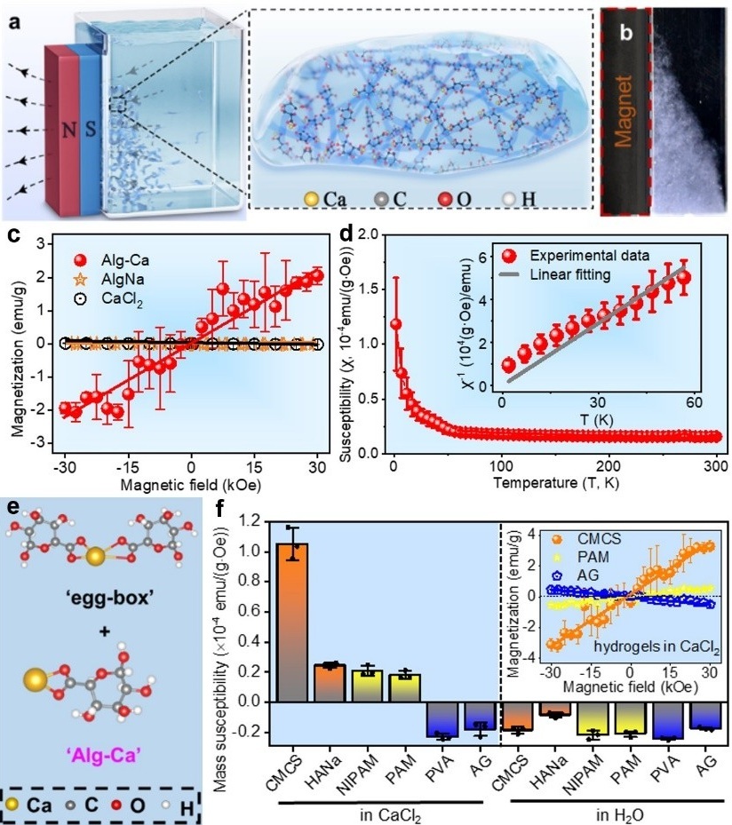 图1.(a)超强顺磁性海藻酸-钙水凝胶示意图;(b)水凝胶被磁铁吸引;(c)海藻酸水凝胶在去离子水中成抗磁性,在CaCl₂溶液中呈强顺磁性;(d)超强顺磁性海藻酸-钙水凝胶M-T曲线,内插图为χ-1-T曲线;(e)无净磁矩的经典“蛋盒”结构(上)和具有净磁矩的“Alg-Ca”单元结构(下);(f)多种水凝胶质量磁化率,包括富含羧基/酰胺基的羧甲基壳聚糖、聚丙烯酰胺和N-异丙基丙烯酰胺水凝胶,以及不含羧基/酰胺基的琼脂糖和聚乙烯醇水凝胶,内插图为羧甲基壳聚糖、聚丙烯酰胺和琼脂糖水凝胶在CaCl₂溶液中的M-H曲线