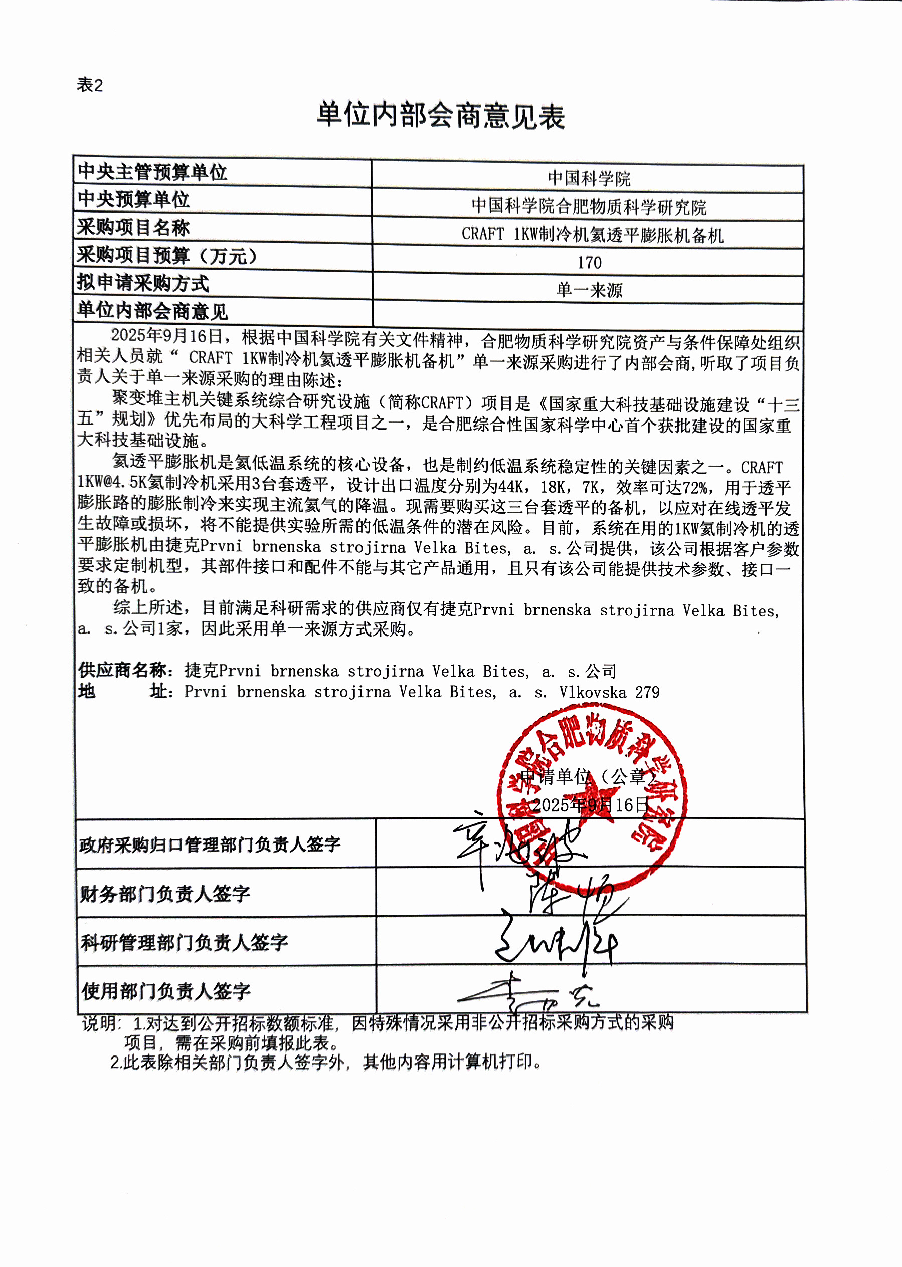 关于《CRAFT 1KW制冷机氦透平膨胀机备机》采用单一来源采购方式的单位内部会商意见的公示(2025.9.24-2025.9.30)