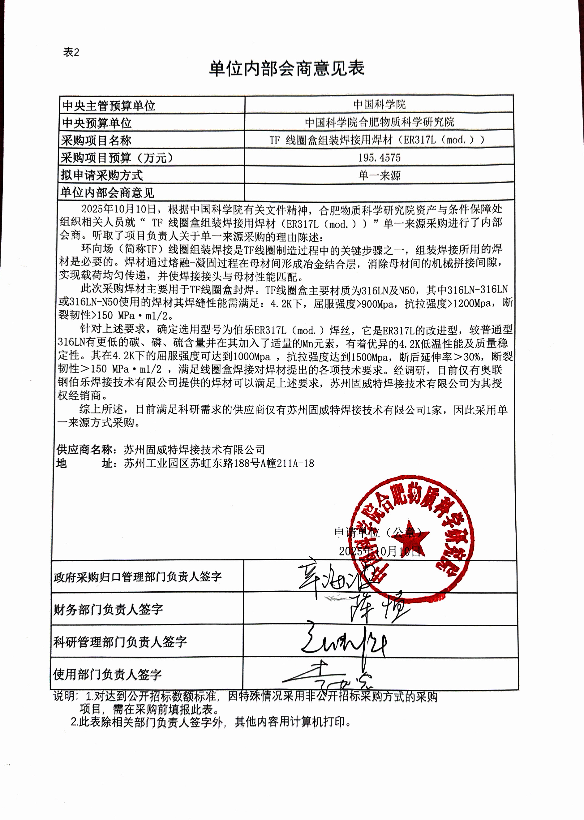 关于《TF线圈盒组装焊接用焊材(ER317L(mod.))》采用单一来源采购方式的单位内部会商意见的公示(2025.10.24-2025.10.31)