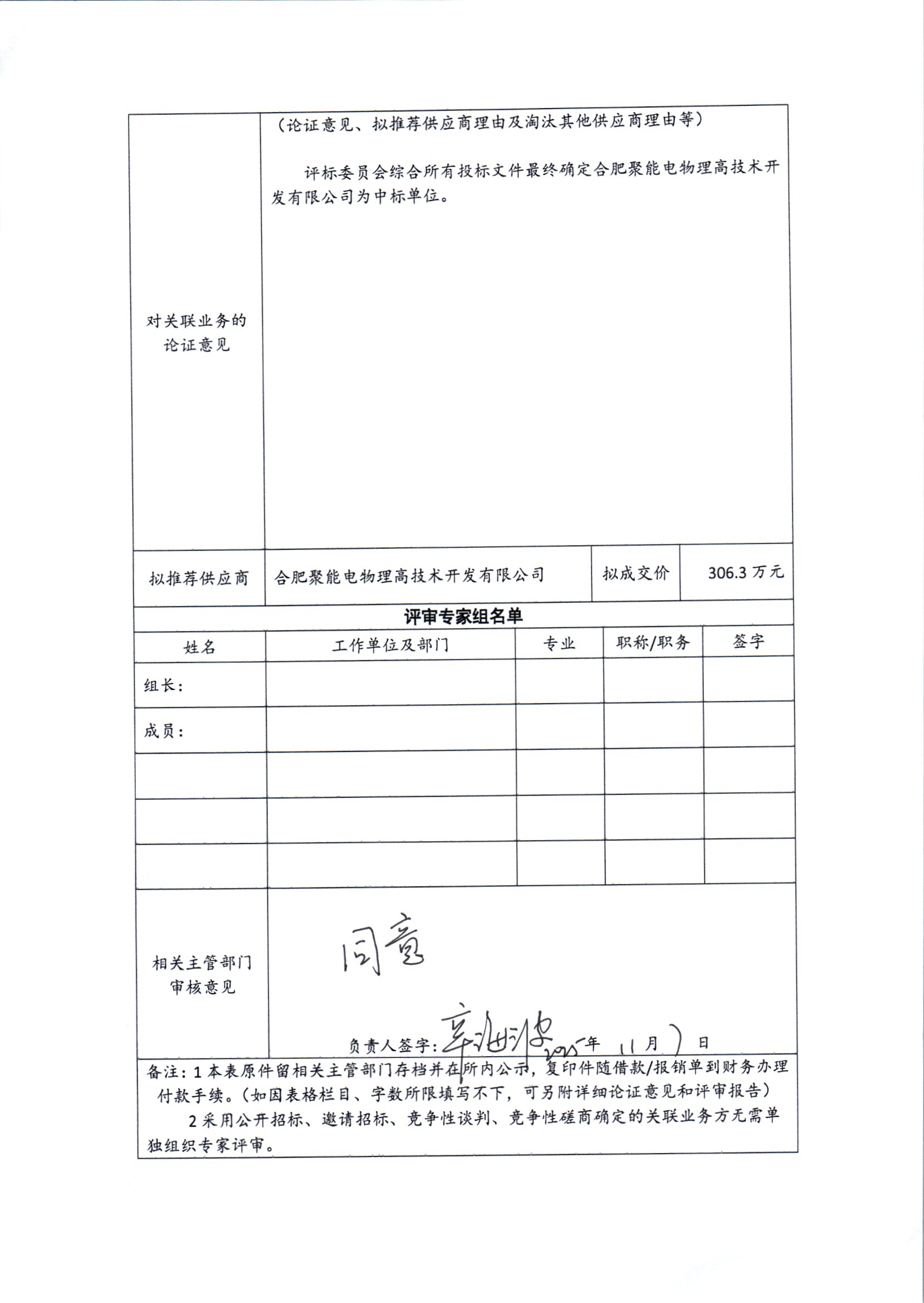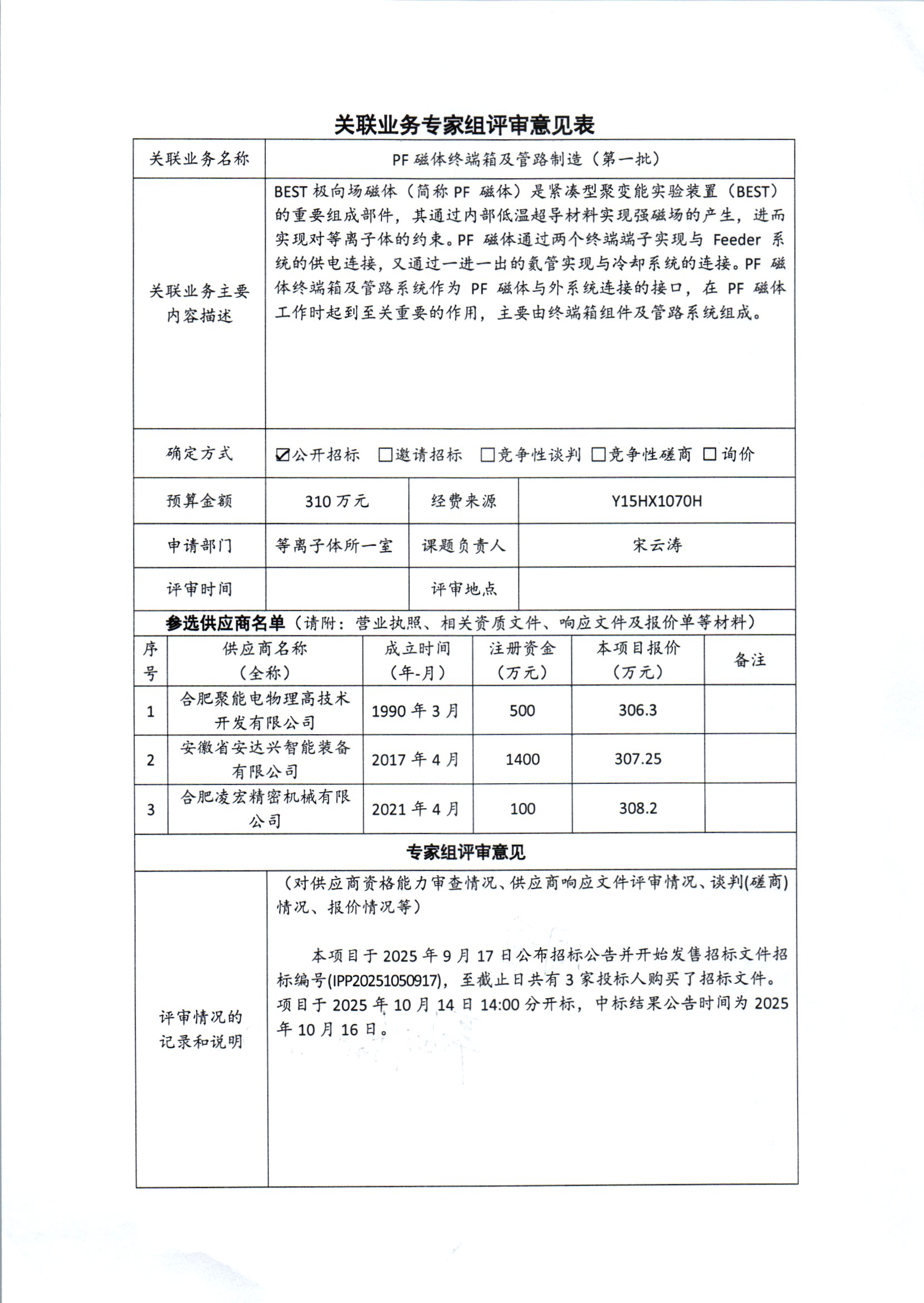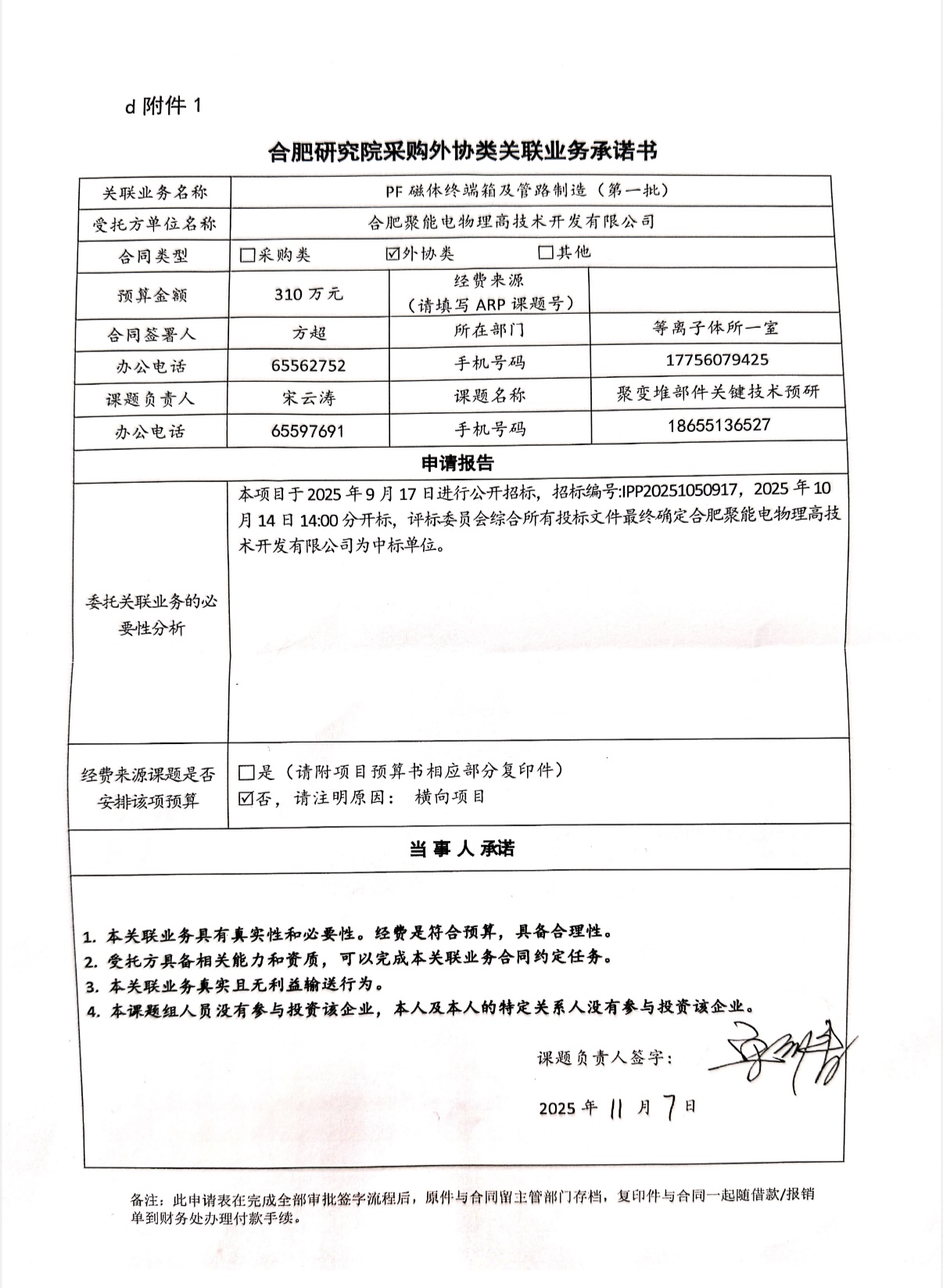 根据《中国科学院关于加强科研项目关联业务管理的暂行规定》(科发条财字〔2015〕125号)、《中国科学院合肥物质科学研究院关于加强科研项目关联业务管理的实施细则》(科合院发资字〔2021〕8号)、《合肥研究院加强关联业务管理暂行办法》(科合院发资字〔2022〕 1号)、《合肥物质院加强关联业务管理补充规定》(科合院发资字〔2025〕1号)要求,现就我院委托合肥聚能电物理高技术开发有限公司进行PF磁体终端箱及管路制造(第一批)的关联业务做公示。