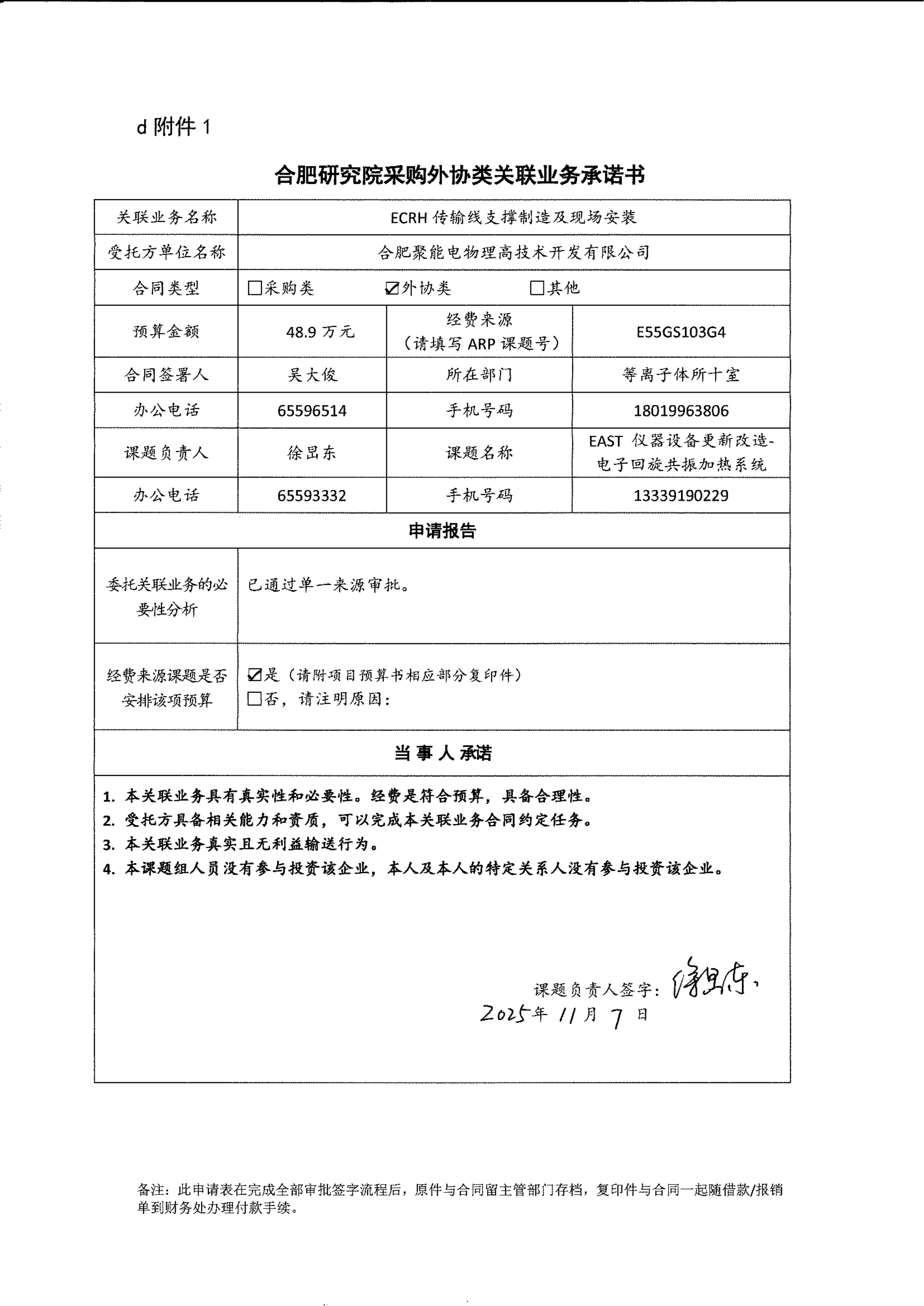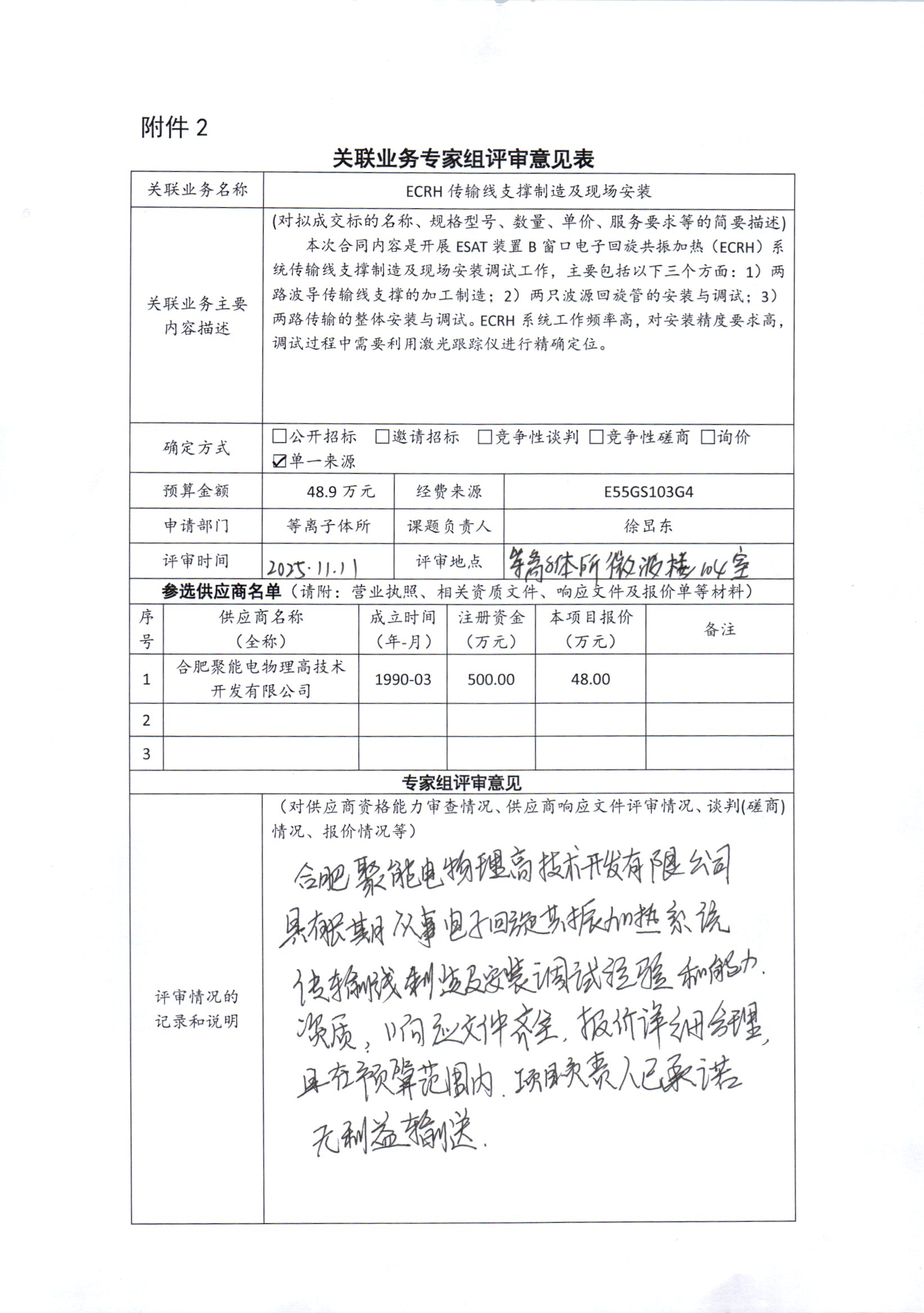 根据《中国科学院关于加强科研项目关联业务管理的暂行规定》(科发条财字〔2015〕125号)、《中国科学院合肥物质科学研究院关于加强科研项目关联业务管理的实施细则》(科合院发资字〔2021〕8号)、《合肥研究院加强关联业务管理暂行办法》(科合院发资字〔2022〕 1号)、《合肥物质院加强关联业务管理补充规定》(科合院发资字〔2025〕1号)要求,现就我院委托合肥聚能电物理高技术开发有限公司进行ECRH传输线支撑制造及现场安装的关联业务做公示。