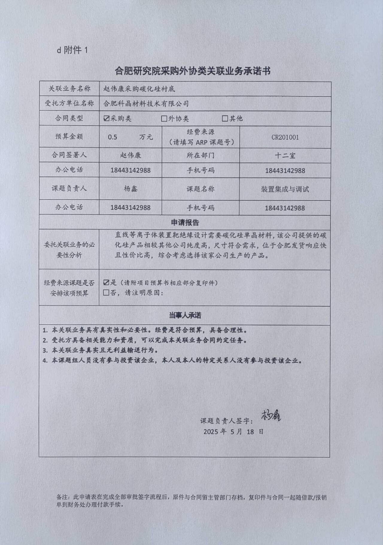 根据《中国科学院关于加强科研项目关联业务管理的暂行规定》(科发条财字〔2015〕125号)、《中国科学院合肥物质科学研究院关于加强科研项目关联业务管理的实施细则》(科合院发资字〔2021〕8号)、《合肥研究院加强关联业务管理暂行办法》(科合院发资字〔2022〕1号)、《合肥物质院加强关联业务管理补充规定》(科合院发资字〔2025〕1号)要求,现就我院从合肥科晶材料技术有限公司采购碳化硅衬底做关联业务公示。