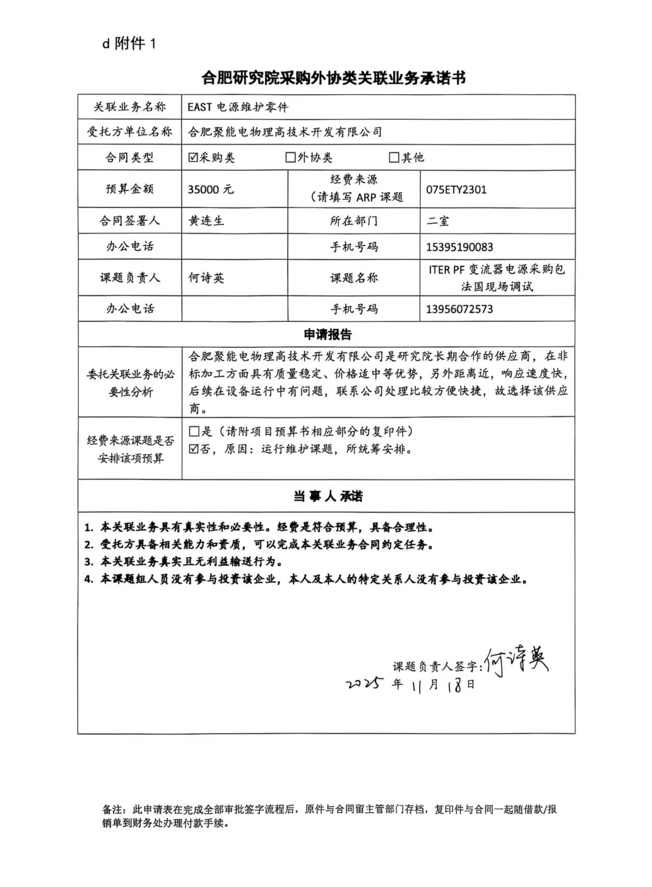 根据《中国科学院关于加强科研项目关联业务管理的暂行规定》(科发条财字〔2015〕125号)、《中国科学院合肥物质科学研究院关于加强科研项目关联业务管理的实施细则》(科合院发资字〔2021〕8号)、《合肥研究院加强关联业务管理暂行办法》(科合院发资字〔2022〕 1号)、《合肥物质院加强关联业务管理补充规定》(科合院发资字〔2025〕1号)要求,现就我院委托合肥聚能电物理高技术开发有限公司加工EAST电源维护零件的关联业务做公示。
