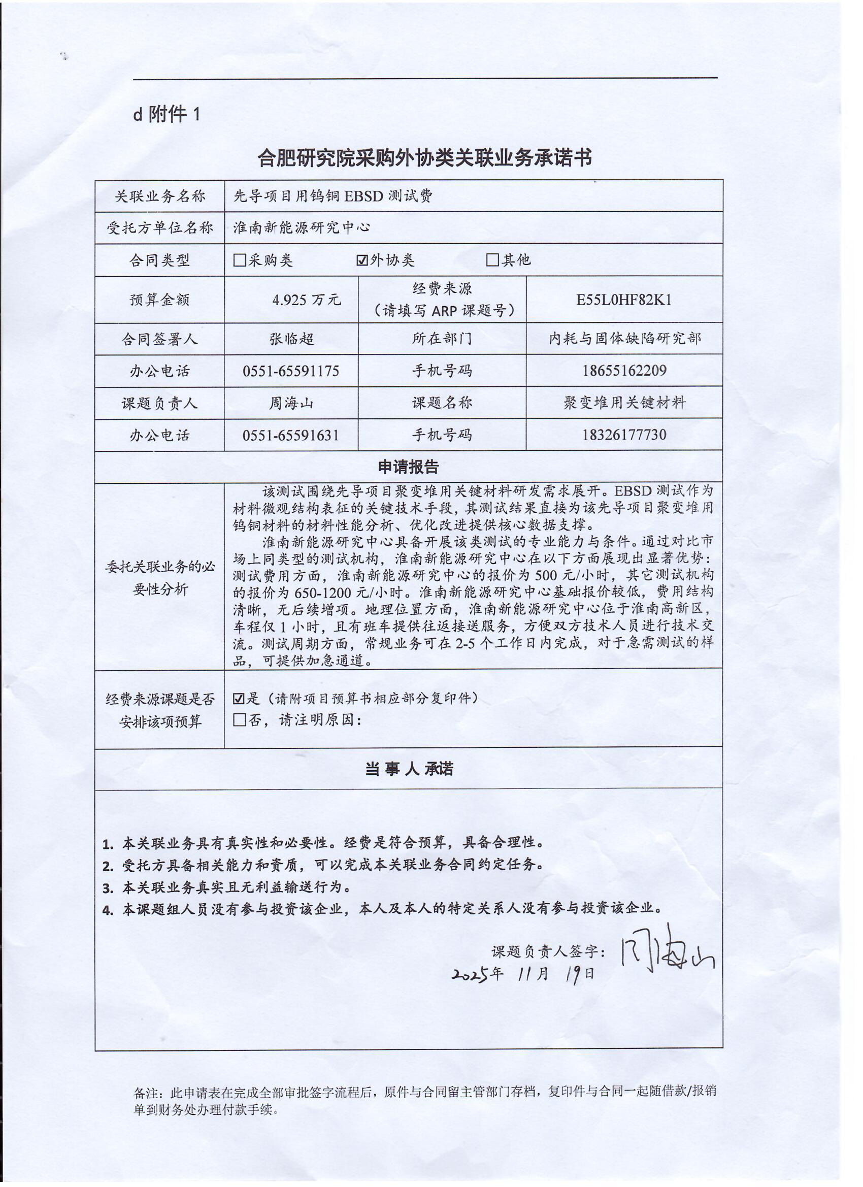 中国科学院合肥物质科学研究院等离子体物理研究所周海山老师委托淮南新能源研究中心进行先导项目用钨铜EBSD测试。此次测试服务于先导项目“聚变堆用关键材料”的研发需求,测试方案的制定、测试过程的实施及最终测试结果的输出,均直接服务于该先导项目中钨、铜材料的性能评估、结构优化及应用可行性论证等核心研发环节,是支撑项目顺利推进的重要技术保障。因淮南新能源研究中心法人为我单位职工,本次采购构成关联交易。