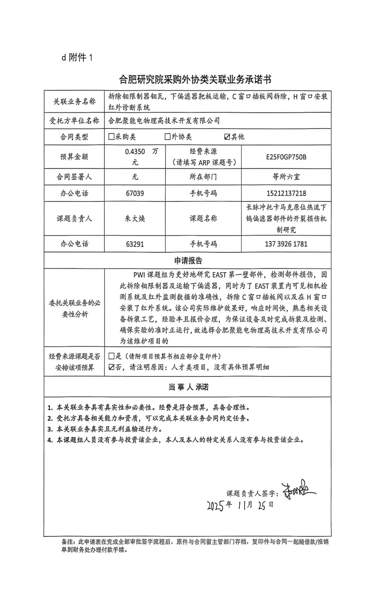 根据《中国科学院关于加强科研项目关联业务管理的暂行规定》(科发条财字〔2015〕125号)、《中国科学院合肥物质科学研究院关于加强科研项目关联业务管理的实施细则》(科合院发资字〔2021〕8号)、《合肥研究院加强关联业务管理暂行办法》(科合院发资字〔2022〕 1号)、《合肥物质院加强关联业务管理补充规定》(科合院发资字〔2025〕1号)要求,现就我院委托合肥聚能电物理高技术开发有限公司进行拆除钼限制器钼瓦,下偏滤器靶板运输,C窗口插板阀拆除,H窗口安装红外诊断系统的关联业务做公示。