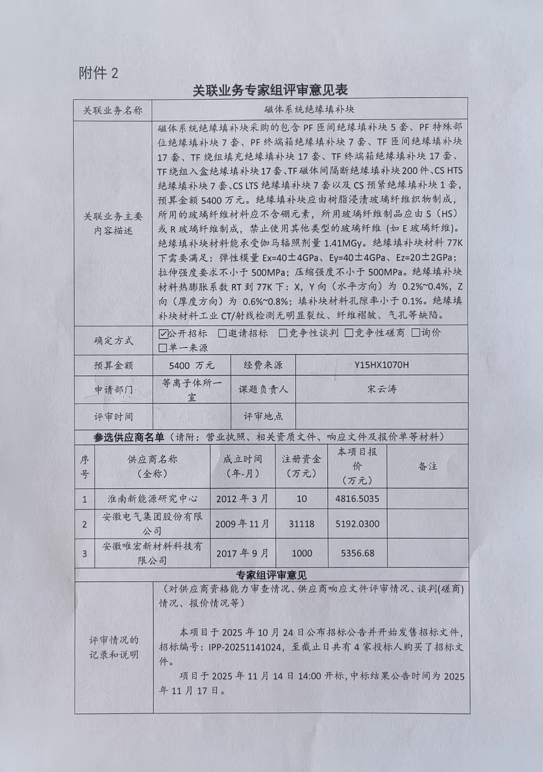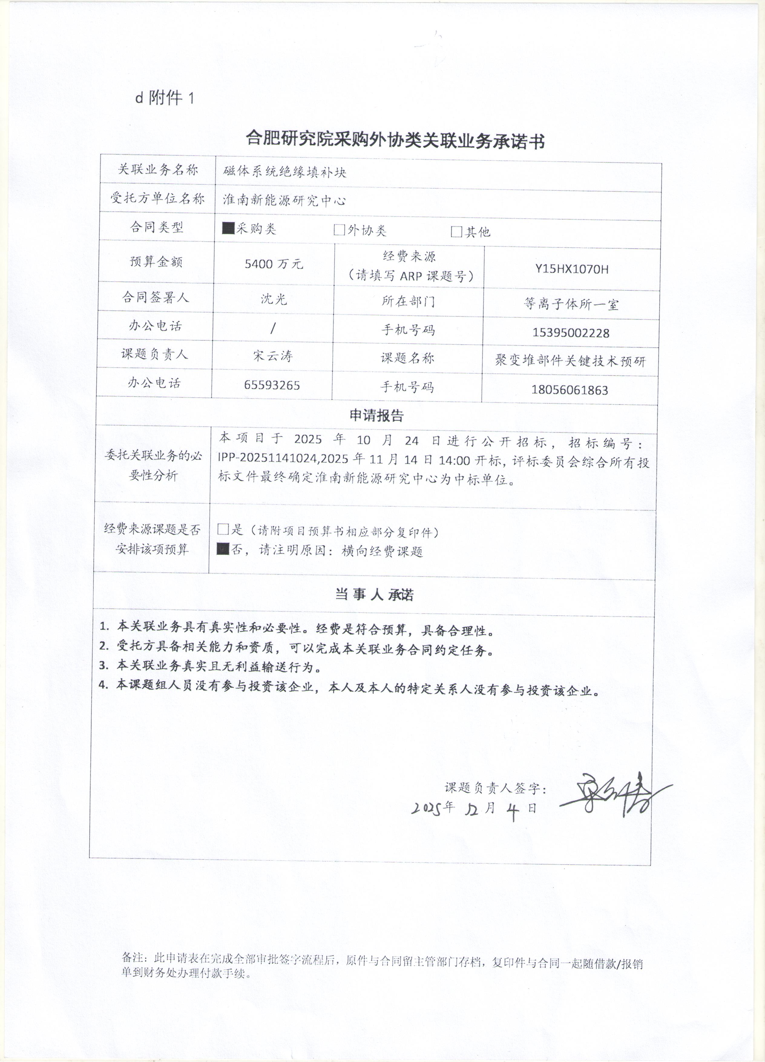 中国科学院合肥物质科学研究院等离子体物理研究所宋云涛老师从淮南新能源研究中心采购磁体系统绝缘填补块。主要用于BEST项目所有超导磁体绝缘填充,BEST项目所有磁体系统匝间绝缘过渡区域填充,接头、氦管等特殊部位间隙填充,绕组间隙填充,TF磁体间隔断以及终端箱出线头绝缘填充等。因淮南新能源研究中心法人为我单位职工,本次采购构成关联交易。
